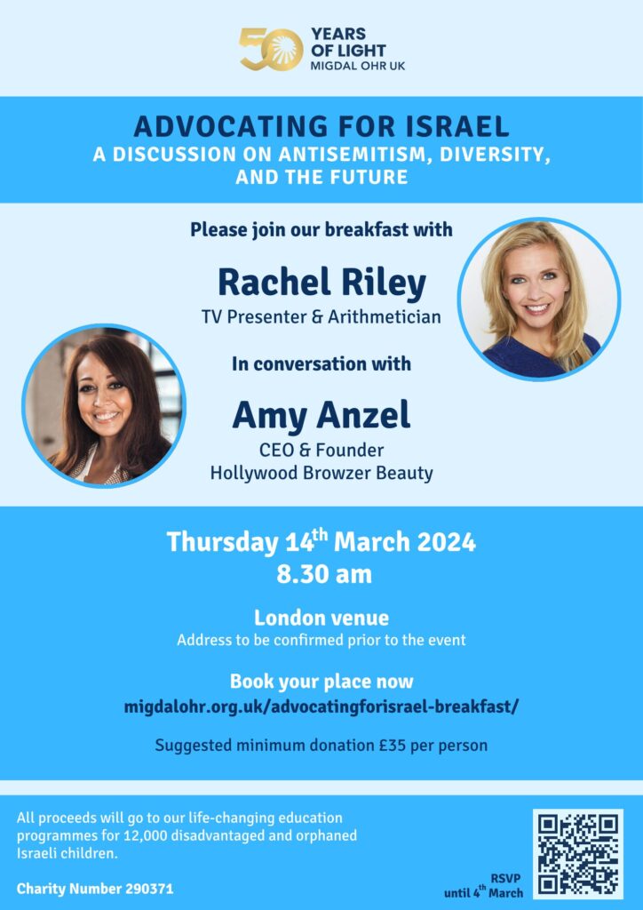 Join us for an engaging breakfast discussion, Advocating for Israel: A Dialogue on Antisemitism, Diversity, and the Future, featuring distinguished speakers Rachel Riley and Amy Anzel. This exclusive event is a platform to explore the significance of supporting Israel, the imperative fight against antisemitism, the importance of diversity, and the collective hope for a brighter future. Through the lens of our esteemed speakers, gain valuable insights and partake in a profound conversation designed to educate, inspire, and mobilise. Don’t miss this opportunity to engage with Rachel and Amy’s inspiring stories and their shared commitment to a cause that resonates deeply within our community. Together, let’s contribute to a conversation that supports Israel and champions a world marked by greater understanding and tolerance.